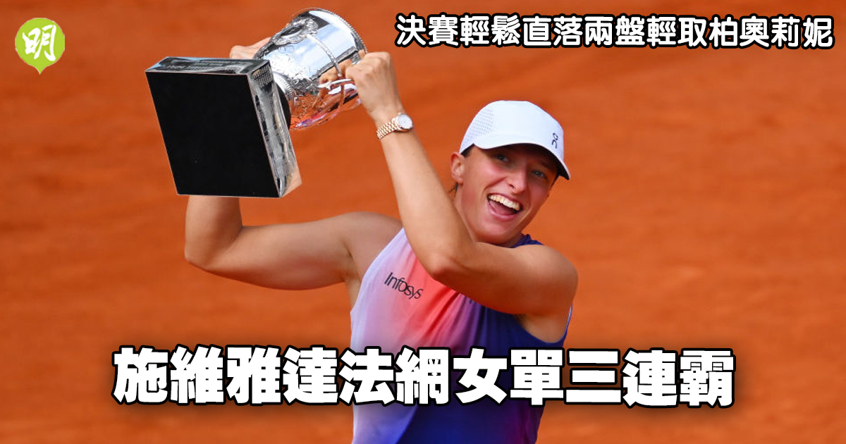 法國網球公開賽今晚(8日)舉行女單決賽,波蘭籍世界一姐的「泥地王后」施維雅達最終輕鬆直落兩盤6:2、6:1,輕取首闖大滿貫決賽的意大利籍12號種子柏奧莉妮,取得三連霸之餘,更在法網跨季取得21連勝,參戰6屆賽事已奪4冠。