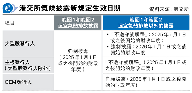 該法規自2025年起分階段實施,所有主板及GEM發行人須強制披露範圍1(經營活動期間直接釋放的溫室氣體排放)和範圍2(購買能源過程中釋放的溫室氣體排放)的氣候信息(見表),納入恒生綜合大型股指數的企業須由2026年起披露其他氣候信息,包括範圍3,即溫室氣體排放(企業價值鏈中的所有其他間接排放),其他主板發行人則遵循「不遵守就解釋」的規定。