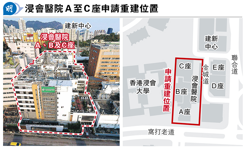 浸會醫院回覆本報指A、B、C座已提供服務逾半世紀,硬件設備及空間急需提升,向城規提交「舊院重建計劃」申請,重建計劃預計於2025年初啟動,目標於2033年落成。為期10年的重建計劃分為兩期,3座大樓將在原址分階段拆卸及重建,並整合成一座綜合大樓,預計2034年全面投入服務。重建後新大樓將由現時589張病牀增加近19%至700張,手術室亦會由現時13間增至16間。