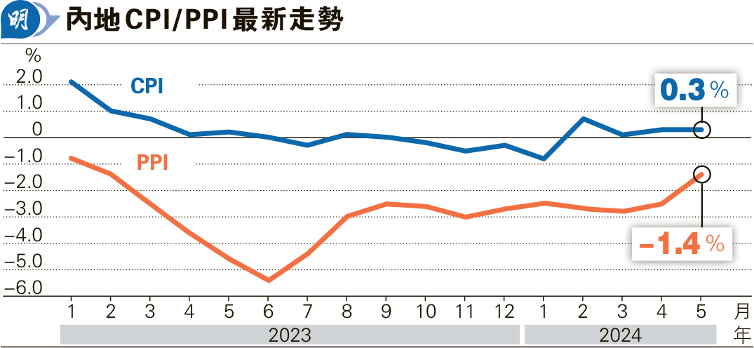 工業生產者出廠價格指數(PPI)按年下跌1.4%,略好於市場預期下跌1.5%,連續第20個月收縮,不過較4月跌幅明顯收窄1.1個百分點,為去年2月以來最小單月跌幅。按月則上升0.2%,是去年9月以來首次按月上升。