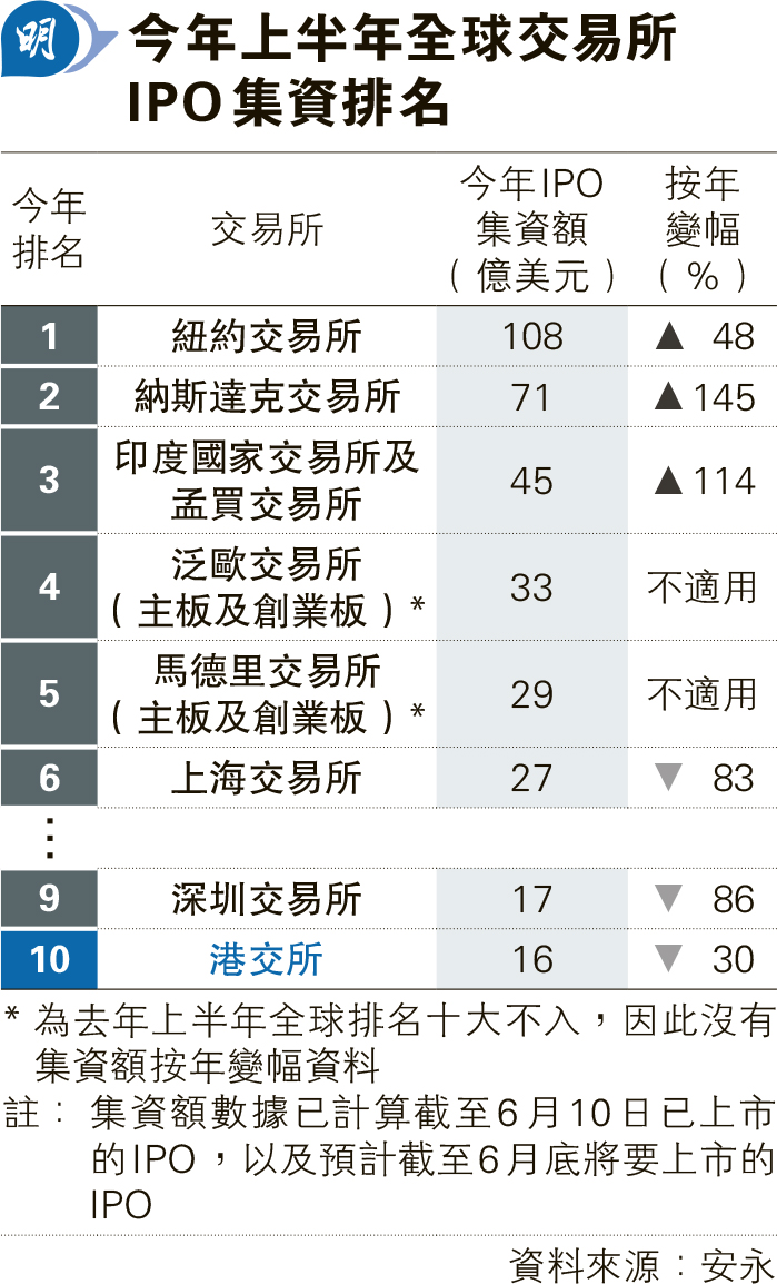 【明報專訊】國際會計師事務所安永數據顯示,本港今年上半年公開招股(IPO)集資額及新股上市數量,分別為121億元和28家,分別按年跌32%及3%。港交所(0388)的全球交易所集資額排名由去年上半年的第六,跌至今年同期的第十(見表)。安永亞太區上市服務主管蔡偉榮預料,本港IPO市場於下半年將有所改善,惟「起色有限」,但他對香港有很大信心,認為香港仍有望於今年全年在IPO集資額及新股上市數量,打進全球排名首五名。