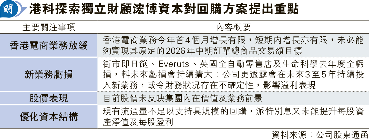 因應今次回購,集團成立獨立董事委員會,並委任浤博資本出任其獨立財務顧問,該委員會參考浤博推薦的意見,認為回購建議公平合理,並推薦股東接納。獨立董事會財務顧問浤博資本發函支持回購,並指該集團在香港的電商業務首4個月增長有限,亦料未來增長有限,未必實現得到2026年中期訂單商品交易額目標。