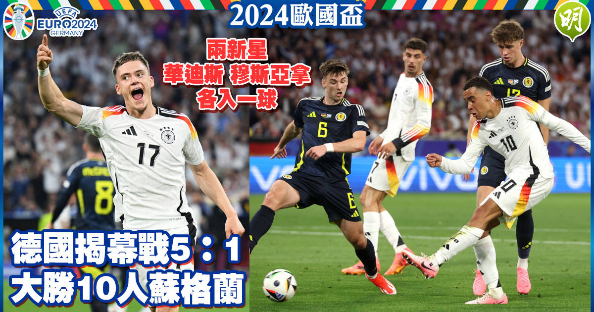 2024歐洲國家盃今晨(15日)開鑼,主辦國德國隊在揭幕戰憑兩名21歲新星科利安華迪斯及穆斯亞拿各入一球,加上夏維斯射入12碼,上半場遙遙領先3球下,以5:1大勝下半場10人應戰的蘇格蘭隊,在A組旗開得勝。