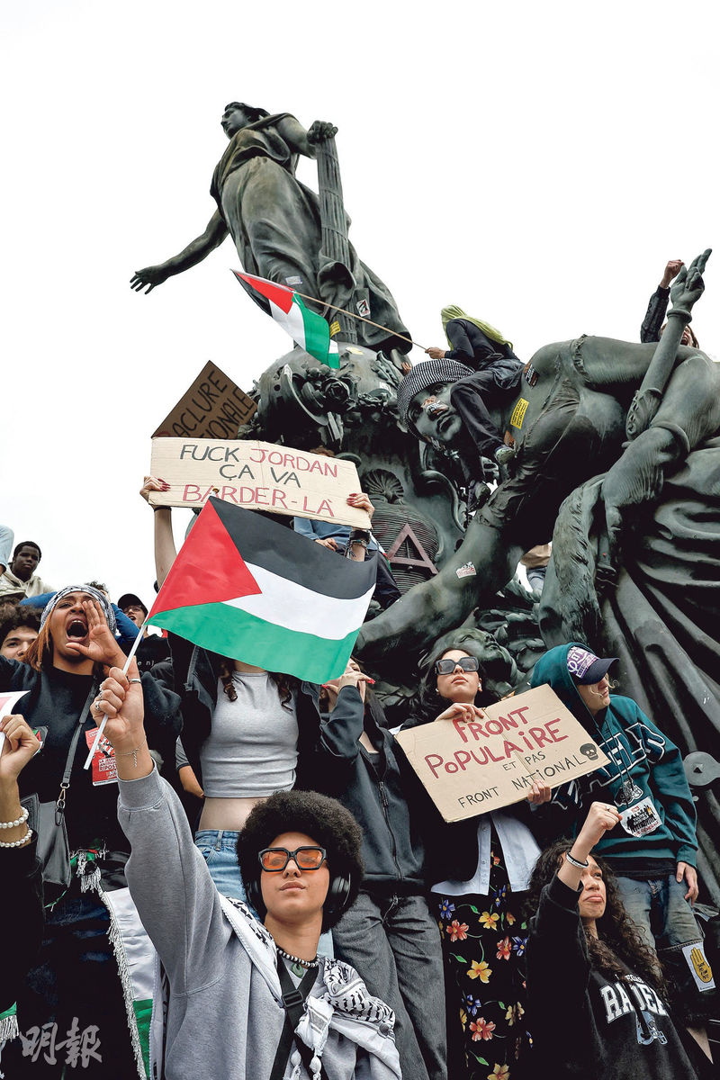 【明報專訊】法國五大工會號召上周六(15日)在巴黎民族廣場(圖)等地舉行的反極右政黨國民聯盟大示威,獲人權團體、社運人士、藝術家和新成立的左翼政黨聯盟「新人民陣線」(New Popular Front)支持,包括社會黨的主席富爾(Olivier Faure)。警方估計全國有25萬人參加。很多示威者表示希望新左翼聯盟能擊敗極右。69歲左翼前總統奧朗德(Francois Hollande)在西南部故鄉科雷茲(Correze)宣布,代表新人民陣線再度角逐國會議席。法國總統馬克龍因見極右的國民聯盟在歐洲議會選舉中得票超過其中間派執政黨一倍,宣布提前大選。第一輪選舉定於6月30日舉行。