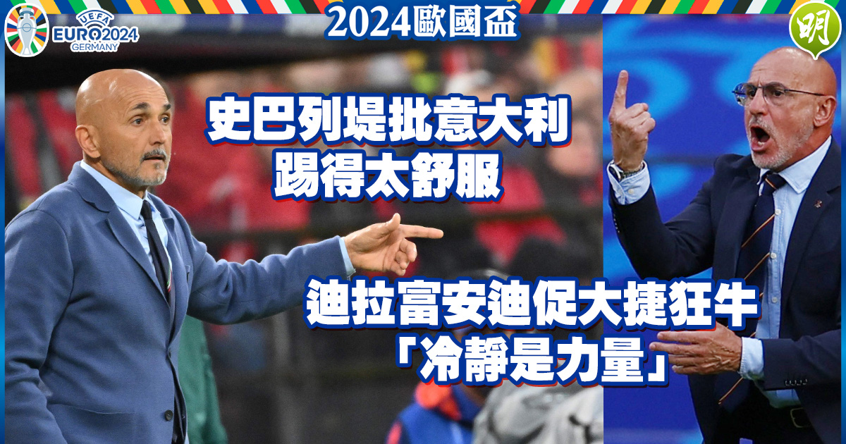 爭取衛冕歐洲國家盃的意大利隊,今晨(16日)與西班牙隊在「死亡B組」首戰,分別反勝阿爾巴尼亞隊和大勝克羅地亞隊,意軍教練史巴列堤不滿麾下此役欠進取和踢得太舒服,周五凌晨的次輪比賽硬碰「狂牛」必須加強侵略性,後者主帥迪拉富安迪則提醒球員此刻「冷靜是力量」,又稱讚獻出助攻的16歲翼鋒耶馬爾前途無限。