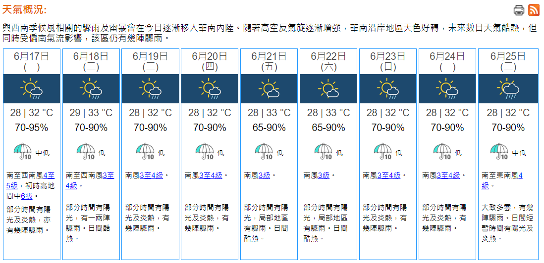 【08:35】上午8時30分,天文台錄得氣溫29.8°C,相對濕度80%。西南季候風正為廣東帶來驟雨。今早(17日)大嶼山及新界部分地區的雨量錄得約5毫米。此外,高空反氣旋正覆蓋南海北部。本港地區今日部分時間有陽光及炎熱,亦有幾陣驟雨。市區最高氣溫約32°C,新界再高一兩度。吹和緩至清勁南至西南風,初時高地間中吹強風。展望未來兩三日部分時間有陽光,有幾陣驟雨,周二(18日)日間酷熱。(天文台)