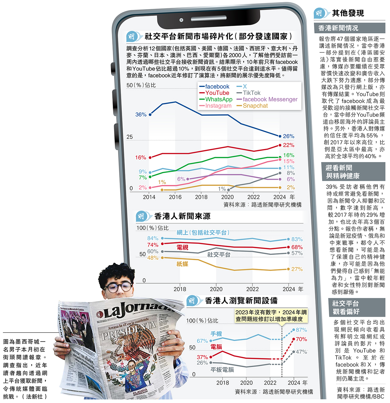民眾亦多用社交媒體、搜尋或大型網站獲取新聞,而非到訪新聞機構網站。縱觀整體市場,只有22%受訪者視新聞機構網站或應用程式為網上新聞主要來源,比2018年少10個百分點。亦有愈來愈多YouTube和TikTok用戶從影片平台的網上評論員、新聞創作者,以至網紅獲取新聞。而在fb和X用戶仍主要接觸傳統新聞機構和記者。在20個較富有國家及地區的調查中,只有17%受訪者表示去年有付費獲取網上新聞。