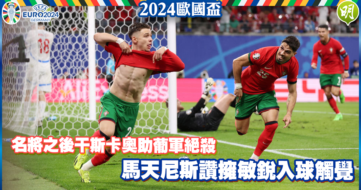 葡萄牙隊今晨(19日)在歐洲國家盃F組首戰「飽食驚風散」下,於完場前靠名將之後的21歲新星法蘭斯高干斯卡奧射入絕殺球,以2:1反勝捷克隊先拔頭籌。賽後葡軍主帥馬天尼斯盛讚該名葡軍名宿干斯卡奧的兒子在禁區內擁有敏銳的入球觸覺,以表現證明已準備好貢獻球隊。