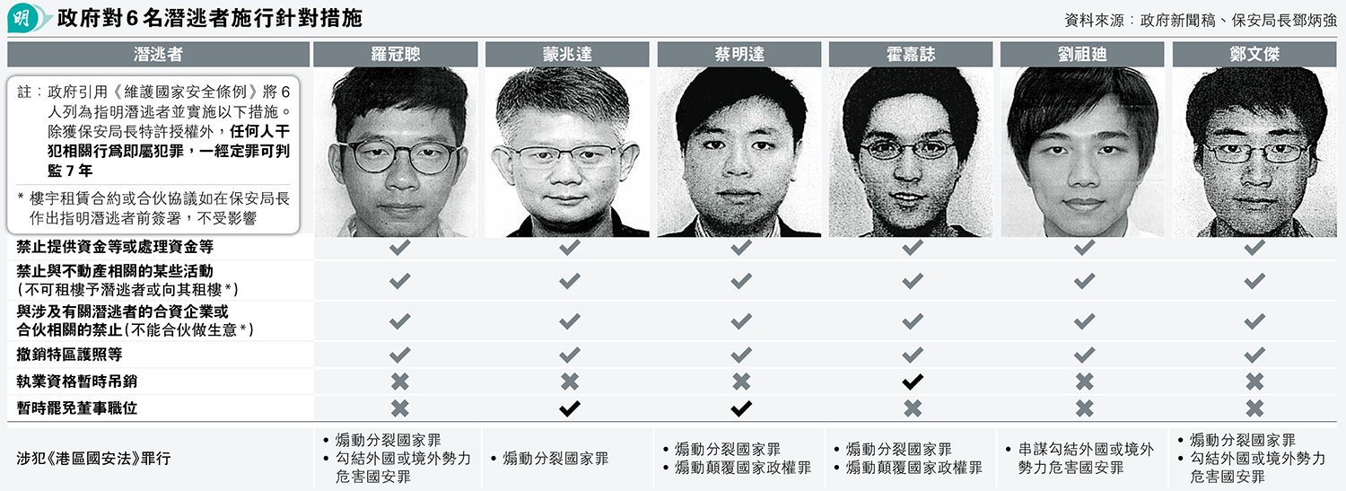 政府上周引用《維護國家安全條例》,將前香港眾志主席羅冠聰等6名在英港人列為「指明潛逃者」,並施加多項限制,包括撤銷特區護照,禁止他人向6人提供資金。律政司長林定國指,有否向潛逃者提供資金的行為,可由市民自行判斷,認為當中不涉法律知識,「就係你畀錢人,你有冇給錢佢先,我有冇畀錢你,我點會唔知啫?」