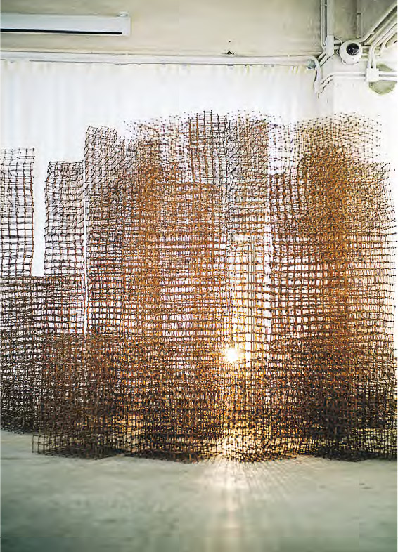 創作來自生活,Sikdar撿拾掉落地上的棕櫚樹纖維,在中醫世家成長的蘇詠寶則用中藥材創作。她的裝置作品《連結》(2017-18)像分子結構模型,看起來脆弱,鄧芷茵卻說遠比我們看來堅固,而且仍散發淡淡藥材味。《連結》模塊用黏土黏合藥材蘇木木條而成,木條花費大量人力切成相若大小,並按照展場築成城市景貌,「高樓」間一盞電燈規律升降,宛如日出日落。