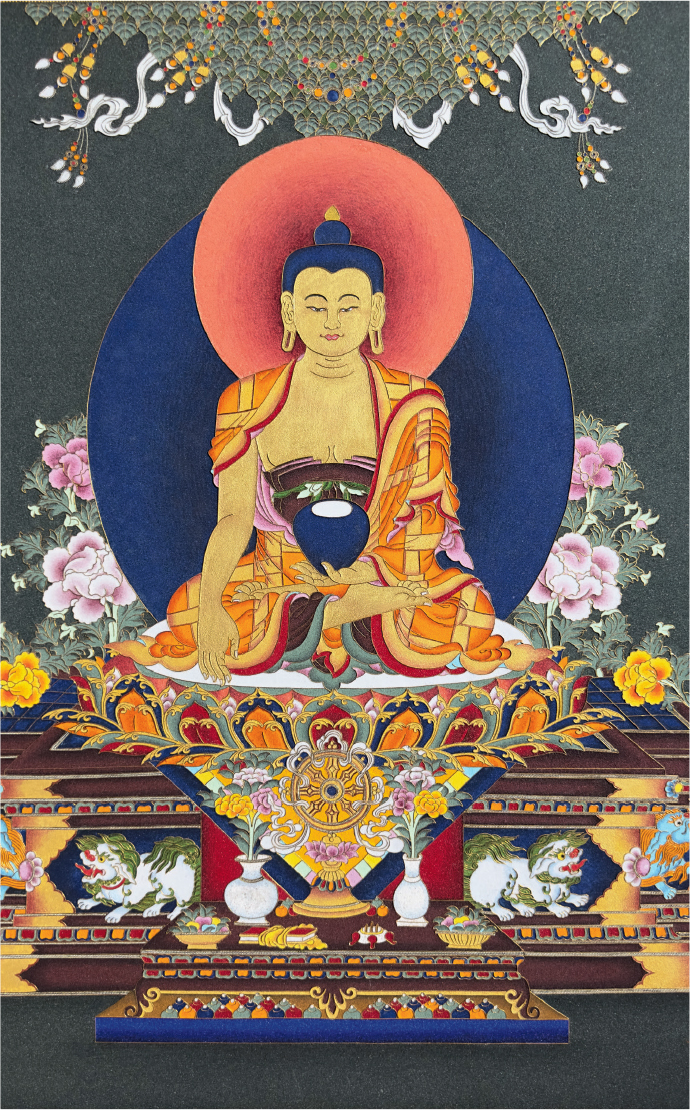 這場修行歷經年月,由唐卡的布料怎麼做、顏料怎麼做、膠彩怎麼做,每個步驟都需謙卑磨練。最初實踐掐絲唐卡時,次成諾布覺得用琺瑯顏料製作唐卡不夠完美,便逐步摸索如何加上傳統唐卡顏料,調和出漸層效果。比如「24K純金釋迦牟尼佛掐絲琺瑯唐卡」中,釋迦牟尼佛背後的景泰藍圓環,就成為黑地色與黃紅主調間的過渡,為深邃的黑底唐卡增添更多層次。