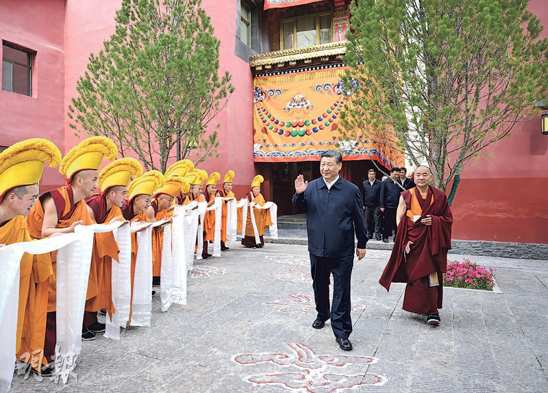【明報專訊】國家主席習近平連日在青海、寧夏考察民族交往交流交融情况。周二(18日)在青海省會西寧參觀藏傳佛教宏覺寺時,習近平指出,宏覺寺在增進歷代中央政府與藏傳佛教聯繫方面發揮了重要的橋樑紐帶作用;要向老一輩革命家學習,把新時代黨的統戰、民族、宗教工作做得更好。