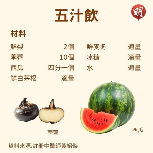 今日(21日)是二十四節氣的夏至,註冊中醫師黃紹傑接受明報電子平台組訪問表示,夏天宜多吃清熱、消暑和祛濕的食物,如:冬瓜湯、雪梨、荸薺(馬蹄)等;不宜多吃熱性和難消化的食物,以免加重脾胃負擔,以下提供兩個清熱消暑的食譜。