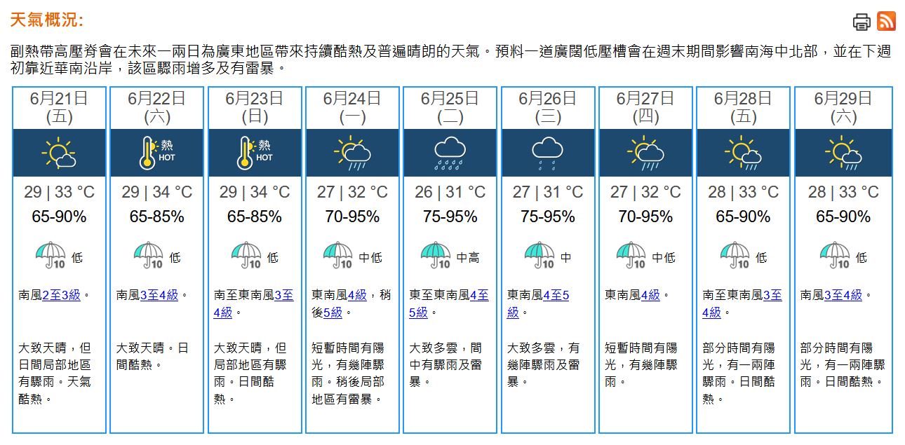 即時熱點 天氣|天文台:酷熱警告生效 市區最高33°C (08:45) 發佈於 2 年 前 2024 年 6 月 21 日 By 明報 上午8時半,天文台錄得30.3°C,相對濕度79%。酷熱天氣警告現正生效。本港地區今日(21日)天氣預測大致天晴,但日間局部地區有驟雨,天氣酷熱,市區最高氣溫約33°C,新界再高一兩度。吹輕微至和緩偏南風。 展望周末期間大致天晴,持續酷熱。隨後一兩日驟雨逐漸增多及有幾陣雷暴。(天文台) 相關文章:天文台天氣天氣速遞編輯推介 Up Next 短片看中西區微型展 市民讚模型細緻「文武廟」逼真 (15:27) 不要錯過 夏至|市民消暑各師各法 喝熱茶、戴面罩及大小風扇抗炎夏【短片】 (08:52) 繼續閱讀 贊助商 猜你喜歡 天氣|天文台:周日早上市區最低14℃ 部分地區寒冷 (17:55) 天氣|天文台:多雲有幾陣雨 今晚轉涼降至約17℃ (09:25) 【Emily】天文台「矚目天氣及氣候事件選舉」 投票有機會獲紀念品 天氣|天文台:周六多雲有雨 晚上轉涼氣溫17至21°C 下周日跌至最低14°C (21:22) 天氣|天文台:短暫時間有陽光 最高19°C (08:24) 天氣|天文台:周四多雲早晚有微雨 氣溫介乎17至20°C (20:57)