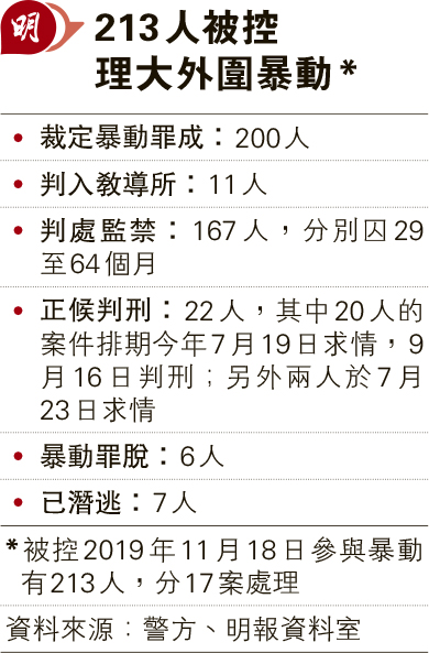 【明報專訊】2019年11月警方包圍理大,有人發起「圍魏救趙」營救理大內示威者,警方拘捕共213人並控以暴動罪。其中一案5人認罪,連同3人經審訊後罪成,昨於區域法院判囚37至50個月。法官稱,本案暴動歷時逾50分鐘,若非警方圍捕,示威者無散去迹象。法官提及一條小巴路線受堵路影響,當日沒有收入,反映示威對公眾帶來不便。翻查資料,理大外圍暴動衍生17宗案件,連同本案已有200人暴動罪成,事隔逾4年仍未劃上句號,尚有兩案未判刑(見表)。
