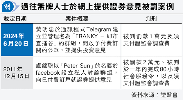 東區裁判法院上周四裁定,黃明忠未領有證監會牌照而在其於Telegram建立並管理的一個接受訂閱的聊天群組中,提供投資意見罪名成立。黃被判罰款1萬元,以及被飭令支付證監會的調查費用。
