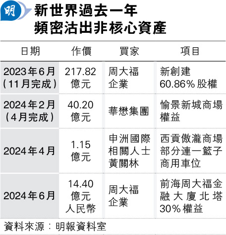 新世界執行副主席兼行政總裁鄭志剛在2月業績會已公布,將出售非核心資產的目標已由60億元調高至80億元,上調幅度達33%,更指部分交易已達非常成熟階段,預計將短期內公布。事後,公司隨即披露以40.2億元向華懋集團出售愉景新城(D Park)商場(見表)。