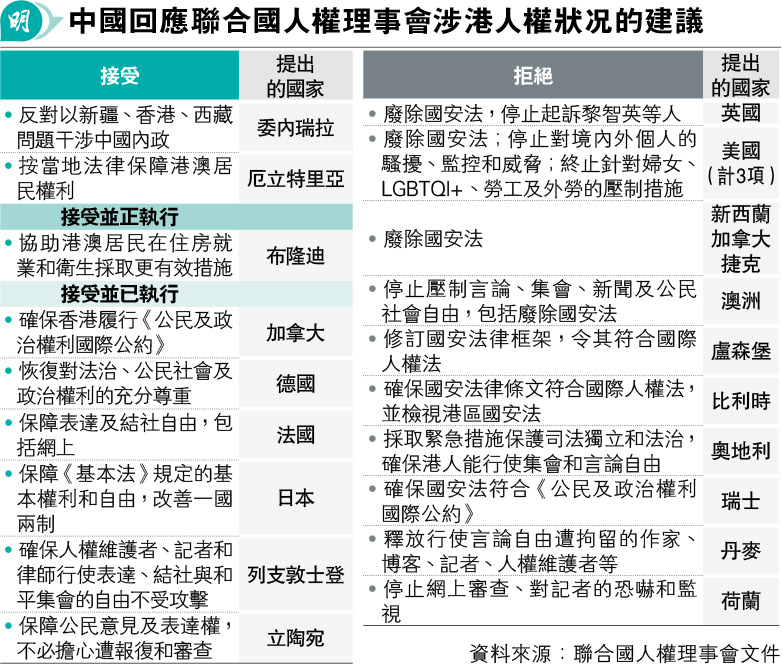 在涉及香港的建議中,中方接納委內瑞拉提出「反對以香港、新疆及西藏問題干涉中國內政」的建議,也分別接納加拿大、日本、德國、法國、日本提出確保香港履行國際公約、充分尊重法治、保障表達和結社自由等建議,中方稱已落實上述建議。就加拿大及德國的建議,中方強調特區一向全面遵守《基本法》及其他國際公約條文的人權保障要求。