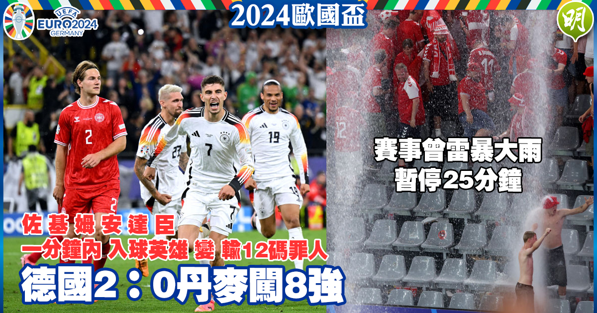 歐洲國家盃主辦國德國隊在今晨(30日)16強,曾雷暴大雨暫停賽事約25分鐘下,憑夏維斯下半場初段射入12碼,以及穆斯亞拿射入今屆第3球,以2:0擊敗丹麥隊,晉身8強。丹麥守將佐基姆安達臣由曾經入球但因隊友「鞋尖越位」被判「詐糊」,緊接卻犯手球輸12碼,短短一分鐘由英雄變罪人。