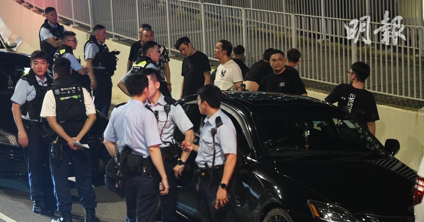 多輛警車前後包圍4輛私家車與七人車,部分警員穿上戰術背心在旁戒備,警犬亦奉召到場協助逐一搜查車輛。經調查後,全部涉嫌非法集結被捕,分別由多輛警車帶署扣查。
