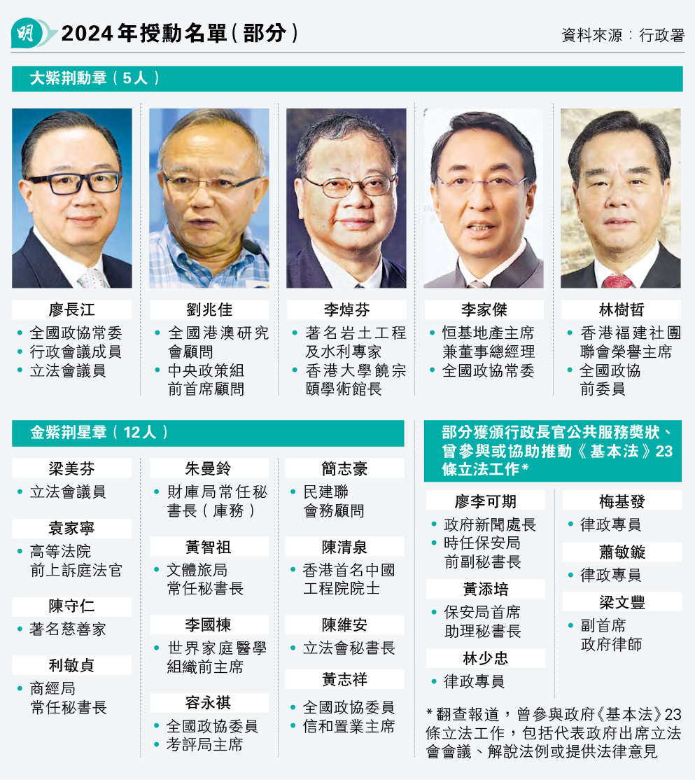 【明報專訊】政府今日公布502人受勳名單,獲大紫荊勳章,金、銀、銅紫荊星章的合計81人,當中5人獲頒大紫荊勳章,包括建制派「班長」立法會議員廖長江、全國港澳研究會顧問劉兆佳及恒基地產李家傑。今年170人獲頒行政長官公共服務獎狀,幾乎是去年的兩倍,包括多名有份推動《基本法》23條立法的官員,如保安局前副秘書長、現任政府新聞處長廖李可期。