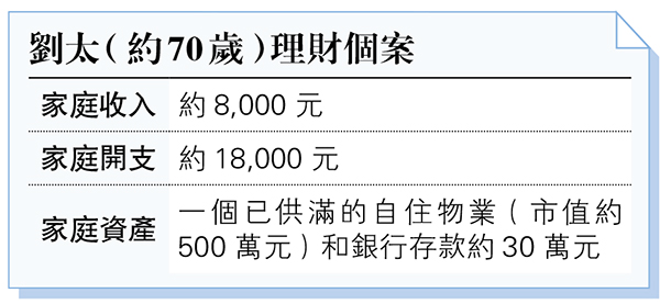 筆者認為增加收入是必須要做的,而根據資料,似乎只有自住物業這一資產可用。假設現時去申請安老按揭的話,每月可領約16,000元年金至終身,由於安老按揭的年金本質上是貸款而不算是入息,故此不影響長者生活津貼的安排,所以每月收入將增加至約24,000元,馬上「鬆動」了不少。客觀來說,劉太今年不申請,最遲明年也該考慮申請了。