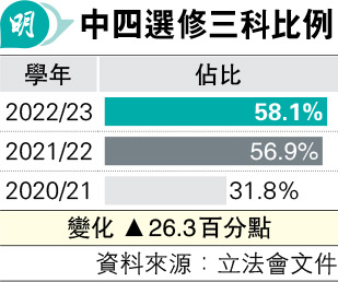 改動科目後,教育局認為釋出課時有助學生選讀多一個選修科,指上學年(2022/23)約六成(58.1%)中四生讀3個選修科目(見圖),較過往顯著增加。
