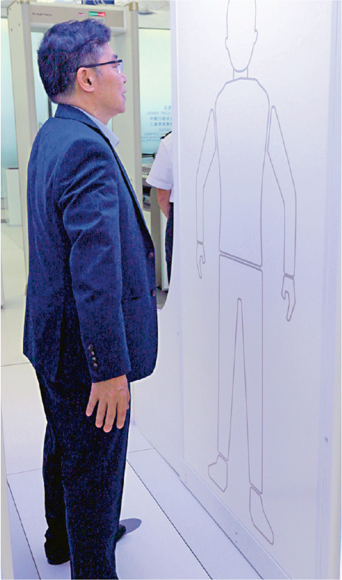 片段紀錄咗局長成個過安檢程序,佢將電腦、充電寶同搓手液放入一個灰色手提電腦袋,將個袋放喺輸送帶上嘅托盤後,就向前行通過金屬探測拱門,然後嚟到新增嘅「人體全身掃描器」面前企定定,由儀器探測身上物品,通過後就繼續向前行,攞番托盤入面嘅嘢。旅客如果遺留物品,系統亦會發聲響提示。