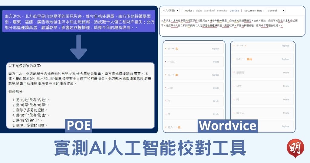 人工智能(AI)工具可助中文文章校對。明報電子平台組記者以一段夾雜簡體字、口語、錯別字及標點符號錯誤的文章,測試兩款工具「Wordvice AI」及「POE Assistant」校對功能。