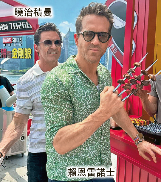 【明報專訊】《超時空亞當計劃》桑里維(Shawn Levy)執導、賴恩雷諾士(Ryan Reynolds)與曉治積曼(Hugh Jackman)合演的Marvel超級英雄片《死侍與狼人》(Deadpool & Wolverine),本月26日美國與內地同步開畫,此片世界巡迴宣傳之旅,前日亦以上海為首站,三人現身上海影城跟內地粉絲見面,並公開新片首35分鐘內容及兩分鐘精華片段,證實部分網上傳聞可信,包括馬克路法奴(Mark Ruffalo)飾演變形俠醫將會在其中一個多元宇宙跟「狼人」曉治積曼對戰,後者亦以不同版本登場,包括《盧根》的晚年狼人甚至喪屍狼人。