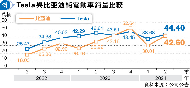 Tesla次季交付量按年跌4.8%至44.4萬輛(見表),但按季升14.8%,優於市場預期的43.8萬輛,並連續兩個季度反超比亞迪純電動車銷量。以比亞迪純電動車銷量來看,次季按年升21%至42.60萬輛,按季更升42%,惟較去年未季最高峰的52.64萬輛銷量有所放緩;若合計純電動車和插電式混合動力車(PHEV)的銷量,比亞迪次季交付則達98.67萬輛,按年升40.2%。