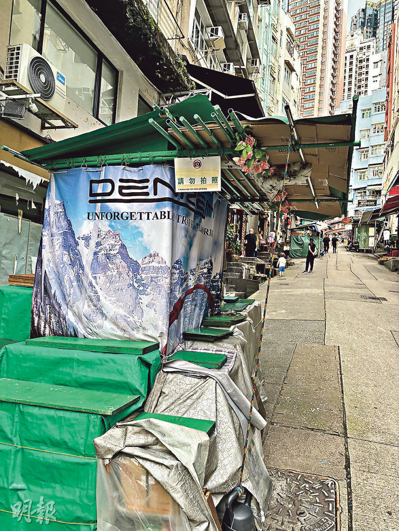 中環荷李活道轉入斜巷伊利近街,沿路有十多個街邊檔口,第一間看到的綠色鐵皮檔是販售粉麵和甜品的食肆,最著名是它的海帶綠豆沙。檔口鮮明地寫到「不准拍照 NO PHOTO」,在網上引起了一陣討論,懷疑遊人打卡造成過多滋擾所致。標示固然事出有因,記者趁七一回歸假期欲拜訪店家,卻發現店舖從這天起開始停業避暑,9月初才重新營業。詢問鄰近店家,他們表示由於附近是小紅書推薦景點,帶動人流路經此處,綠皮檔口位置剛好有一幅壁畫,檔主會用發泡膠遮掩,避免遊人打卡影響營業。翻查小紅書,伊利近街並非推薦景點,不過西有PMQ,東有大館,沿路是中環壁畫。