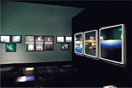 群展的精彩正在於如何串連不同觸覺視野,這個展覽集結18位攝影師作品,包括日本國內外的攝影師所拍攝的富士山。場內燈光昏暗,甫入場看到山內悠的代表作之一《夜明け DAWN》,是他自2006年起長住在富士山七合目的山間小屋時所創作,以富士山作為地球與宇宙之間的分界,捕捉黎明時分的雲平線奇觀。另一邊是広川泰士的黑白攝影,以長時間曝光拍攝富士山上空的星軌運動,與之相對的是公文健太郎圍繞富士山的水與火,以及稍縱即逝的螢火蟲光芒。這個空間作為展覽起點,影像畫面鮮艷奪目,首先烙下這座神山令人驚歎崇敬的大自然象徵。
