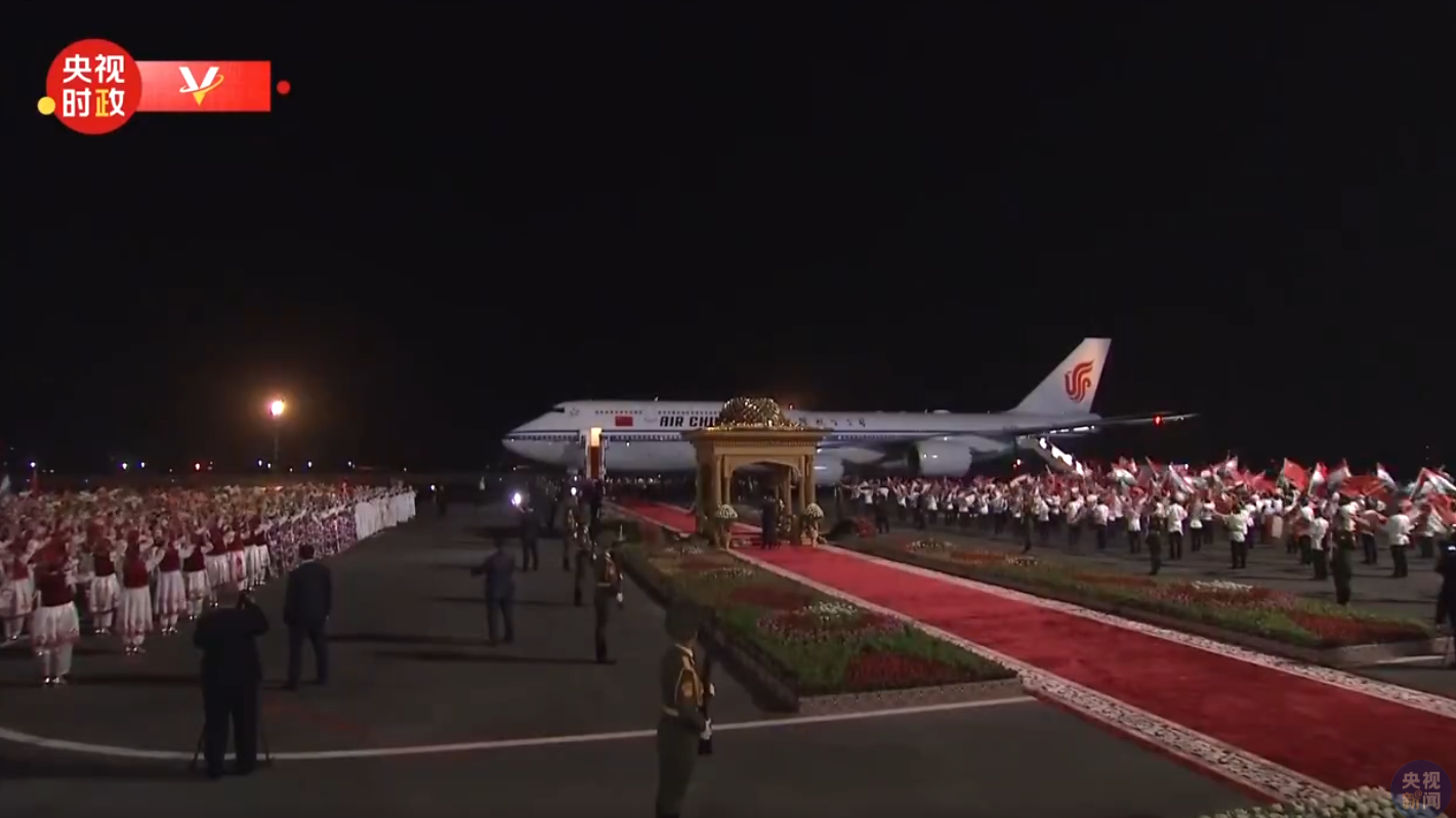 央視畫面顯示,習近平專機抵達時,數百名塔吉克青年男女揮舞兩國國旗、鮮花,在停機坪熱烈歡迎。