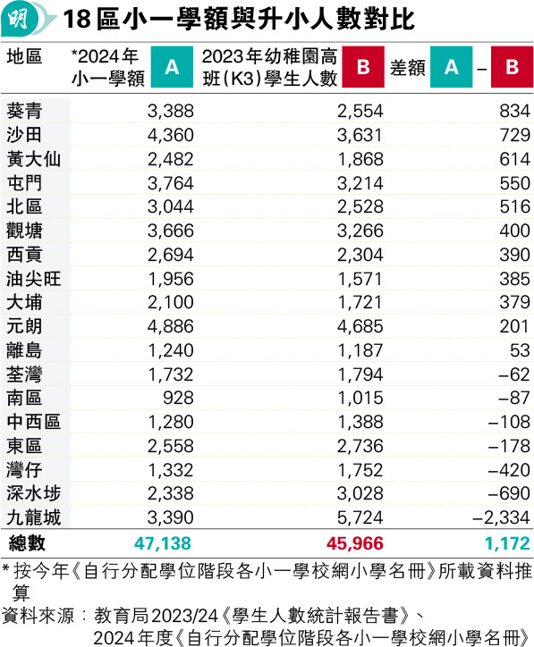 【明報專訊】近年升小適齡學童數目持續處於低位,掀縮班殺校危機。根據教育局《學生人數統計報告書》,去年9月有45,966名幼稚園高班(K3)學生,倘他們全數原區升小,18區中有11區會學額過剩,其中以葵青區多出834個學額最為嚴峻。有小學校長表示,小一生源將持續受出生率低衝擊,每年均有不同地區招生嚴峻,形容各校「競爭一直存在」。