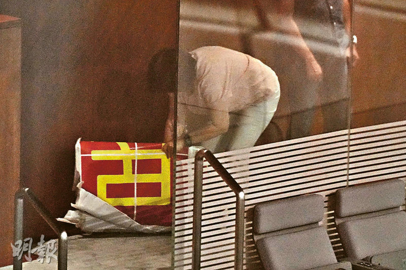 【明報專訊】噚日下晝立法會內委會會議結束後,一眾議員把握與財委會會議之間嘅20分鐘空檔,浩浩蕩蕩趕去會議廳,由秘書處安排拍攝短片賀國慶。Emily同行家希望一睹拍攝情况時,發現會議廳重門深鎖,可以睇到會議廳嘅公眾席同教育廊都封咗,連大門玻璃都遮埋。到底有咩咁神秘?多個議員同Emily講,其實只係一齊高呼幾句口號,祝福祖國富強昌盛、香港繁榮穩定,仲有職員將以紅底、黃色大字印刷嘅口號放喺2樓公眾席提示議員,拍完就匆匆收起(圖)。除一齊拍片,秘書處近日亦邀請議員各自拍片賀國慶,不過每人只講約5秒,有議員話要言簡意賅。