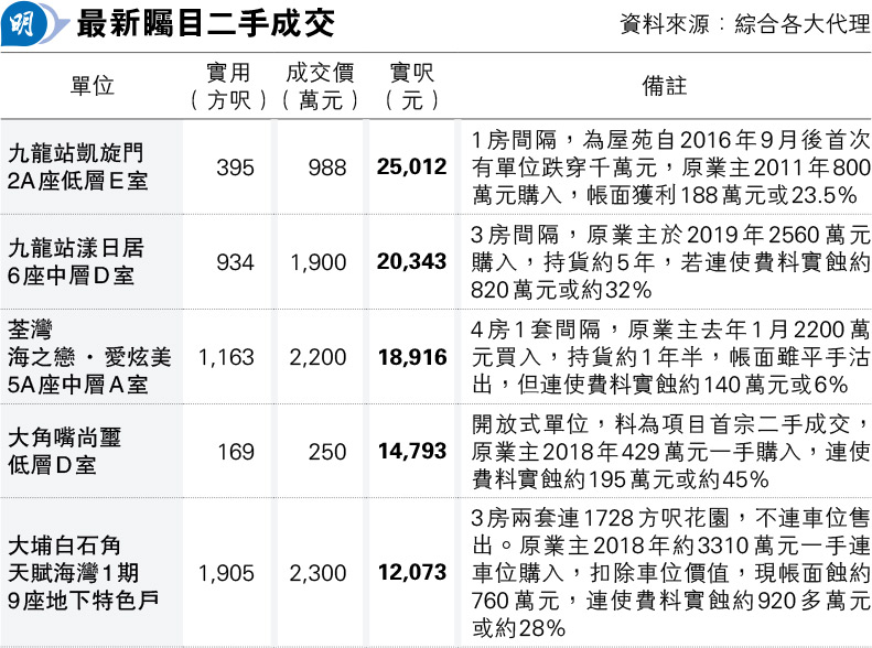 新界區方面,中原地產高級分區營業經理林恩信表示,荃灣海之戀‧愛炫美5A座中層A室,實用面積1163方呎,4房1套間隔,望汀九橋海景,以2200萬元沽出,實呎18,916元,較市價低約4%。原業主去年1月以2200萬元買入,持貨約1年半,帳面雖平手沽出,但連使費計料實蝕約140萬元或6%。大埔白石角天賦海灣1期9座地下特色戶,實用面積1905方呎,3房雙套連1728方呎花園,最新以2300萬元不連車位售出,實呎12,073元,原業主2018年約3310萬元一手連車位購入,扣除車位價值約250萬元,現帳面蝕約760萬元,連使費料實蝕約920多萬元或約28%。