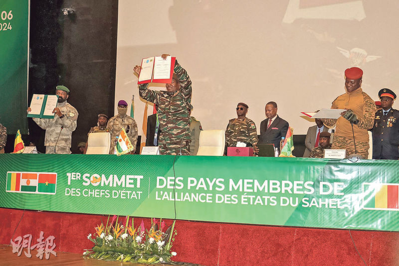 【明報專訊】西非「政變3國」尼日爾、馬里和布基納法索上周六(6日)在尼日爾首都尼亞美舉行3國軍政府上台以來的首場峰會,簽署條約成立「薩赫勒國家邦聯」(圖,法新社),3國軍政府首腦聲言這是踏出「邁向更大融合」的一步。分析認為,此舉既鞏固3國去年9月在馬里首都巴馬科簽署聯防條約所建立的「薩赫勒國家聯盟」,也排除3國在今年1月退出後重返西非國家經濟共同體(ECOWAS)的可能。