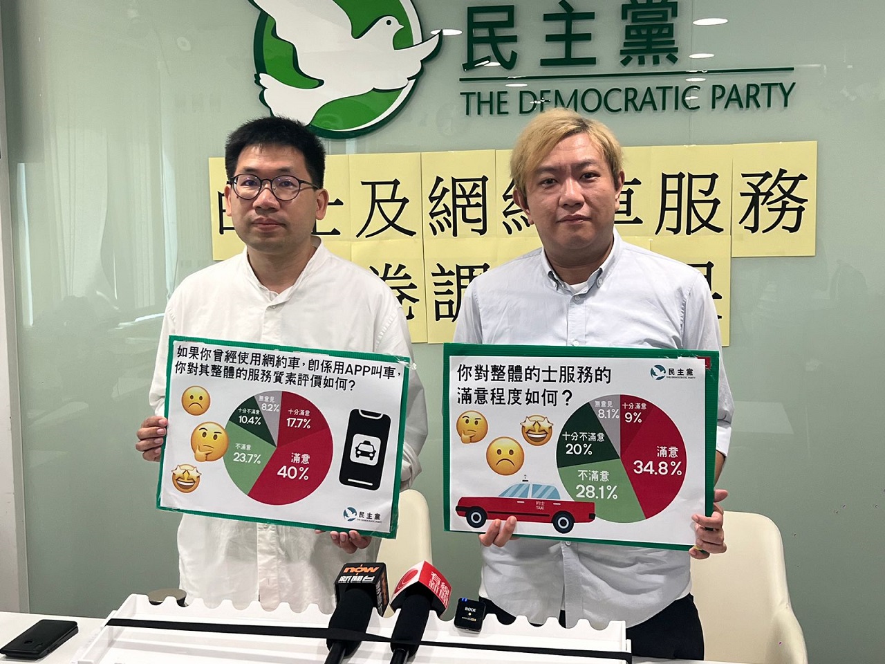 民主黨調查發現,約48%受訪市民對整體的士服務感到十分不滿意或不滿意、約58%則對網約車服務感到十分滿意或滿意,相信原因包括網約車「明碼實價」,亦設投訴機制。民主黨建議政府向網約車平台發出經營牌照,以作出規管。