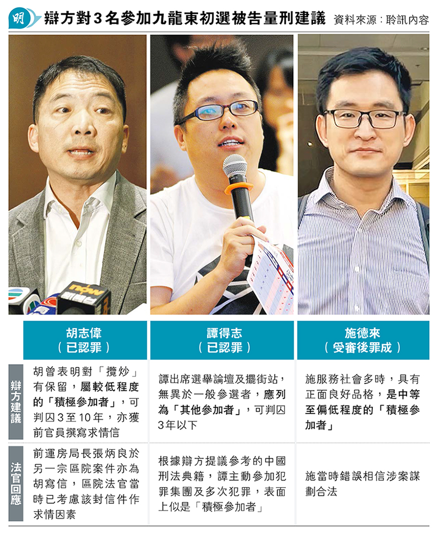 【明報專訊】「35+」初選案45人罪成,參選九龍東的被告昨繼續求情。辯方表示,民主黨前主席胡志偉沒有提倡「攬炒」和無差別否決財案,即使歸入顛覆國家政權罪的「積極參加者」級別,也應判較低刑期。庭上透露,胡志偉獲前高官張炳良、邱誠武和羅致光撰寫求情信,指胡志偉為人溫和理性,備受各界尊重。案件明續,將由九龍西參選人等展開求情,料需3天。