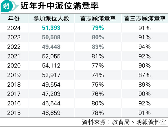 【明報專訊】今日升中派位結果出爐。今年度51,393個學生參加中學學位分配辦法,人數連續兩年上升,按年多1.8%。教育局昨公布79%學生獲派首志願中學,滿意率稍低於近數年的介乎80%至83%。津貼小學議會主席蘇炳輝表示,滿意率較預期稍低,預料學位「鬆動」之下,家長選校心態更進取。他呼籲考慮為子女到中學申請候補位(叩門)的家長,最多到3間中學叩門,避免折騰子女。