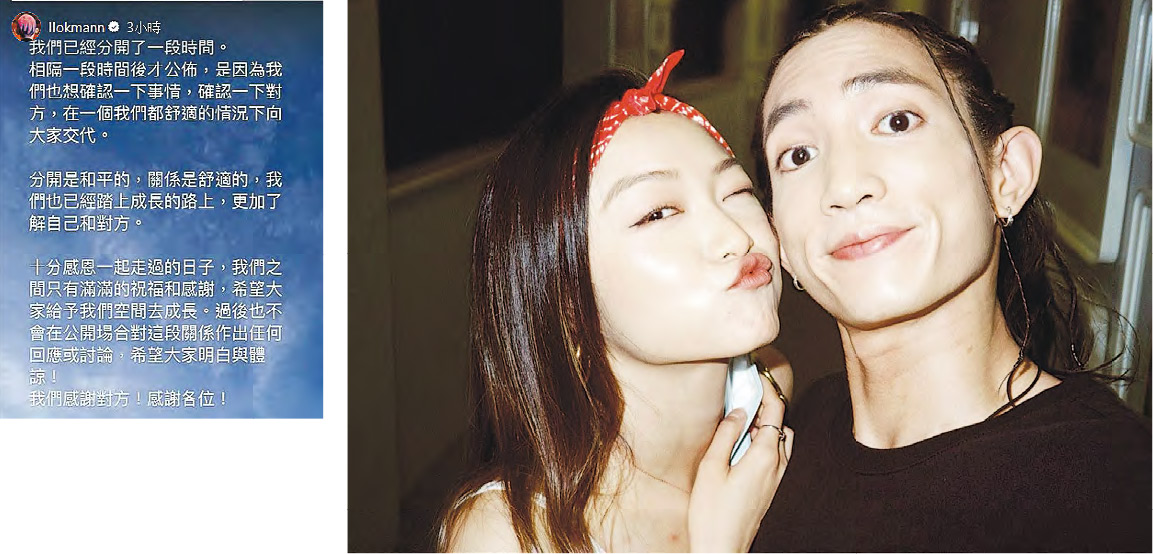 Lokman和Luxi昨日分別在社交平台以同一段文字宣布「分」訊,表示往後不會再回應,「我們已經分開了一段時間。相隔一段時間後才公佈,是因為我們也想確認一下事情,確認一下對方,在一個我們都舒適的情况下向大家交代。分開是和平的,關係是舒適的,我們也已經踏上成長的路上,更加了解自己和對方。十分感恩一起走過的日子,我們之間只有滿滿的祝福和感謝,希望大家給予我們空間去成長。過後也不會在公開場合對這段關係作出任何回應或討論,希望大家明白與體諒!我們感謝對方!感謝各位!」
