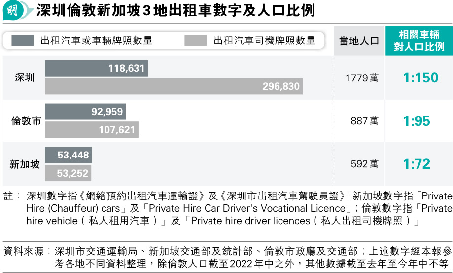 本報昨翻查研究文件曾參考的3個地方,即深圳、新加坡及倫敦資料,發現當地的士以外出租車輛及司機均數以萬計,人口與香港相若的新加坡及倫敦市,出租汽車數量介乎5萬至9萬多(見圖)。