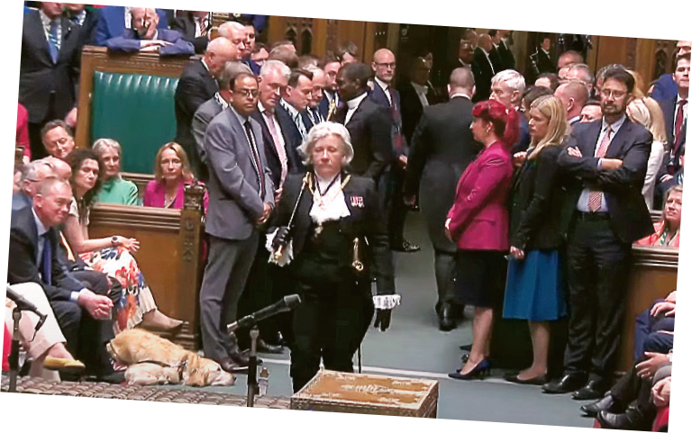 【明報專訊】英國國會噚日係大選後第一次開會,議會新面孔仲多咗隻狗仔,開會期間好好乖咁瞓喺地下,隨即成為網上同英國政界熱話。原來呢隻金毛尋回犬係失明嘅自由民主黨新議員Steve Darling嘅導盲犬Jennie,先前曾幫佢助選,Steve當選後就陪佢由選區坐火車到倫敦開會。自由民主黨72個國會議員影大合照,Jennie都有份㗎。