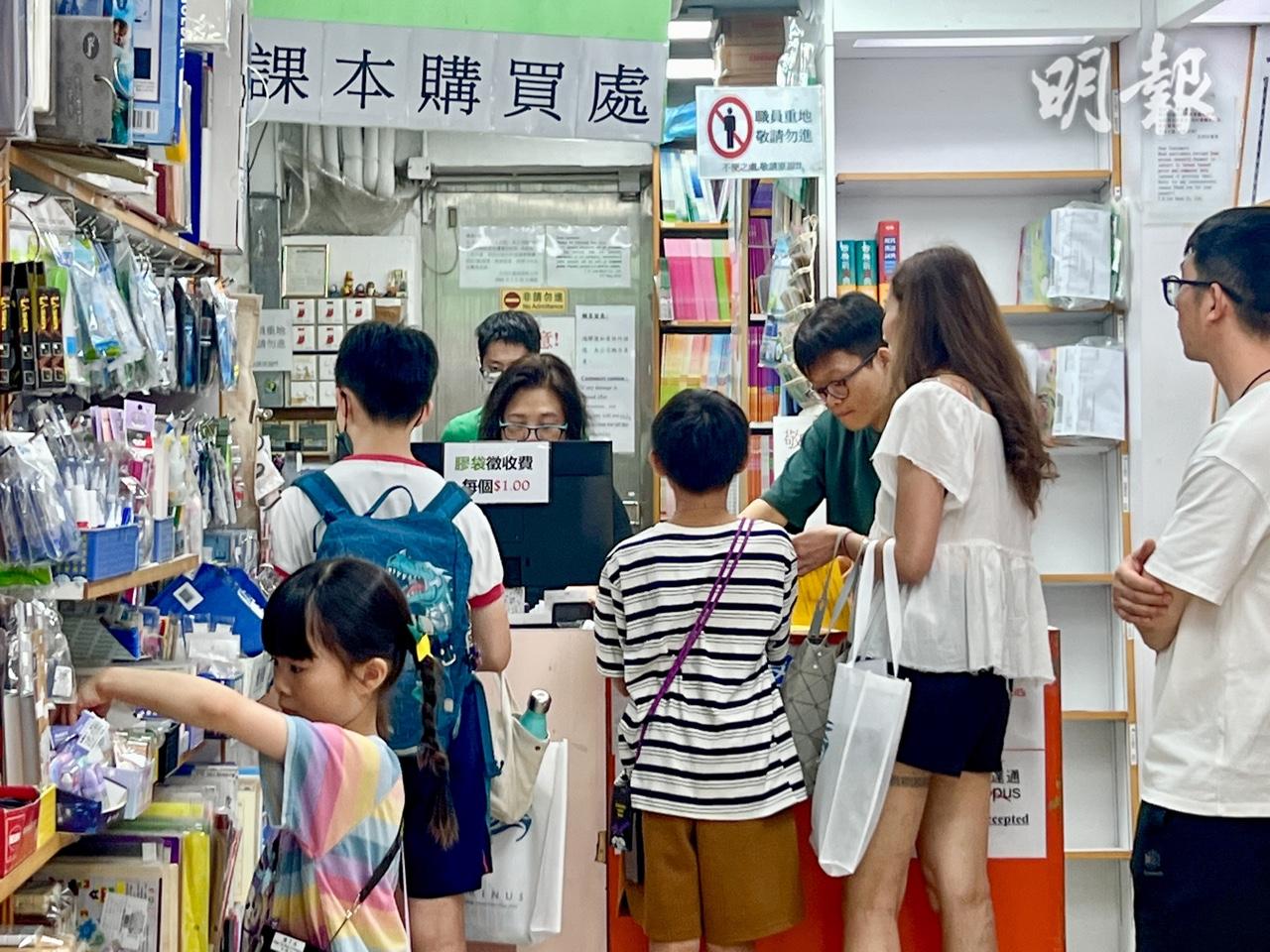 今明兩日是中一註冊日,不少新生和家長今日(11日)辦理註冊手續後就到書局購買新書。本報記者下午到銅鑼灣一間書局觀察,可見較多皇仁書院新生家長到場購買作業。書局員工表示,今早未開門已有家長在外排隊,人龍長達3個舖位,指聞所未聞,料與書局減少有關。