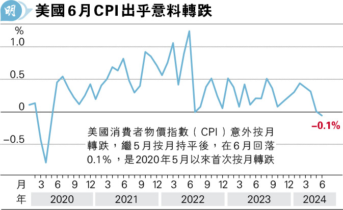【明報專訊】美國通脹顯著降溫,消費者物價指數(CPI)回落幅度大於預期。美國CPI繼5月按月持平後,在6月出乎意料回落0.1%,是2020年5月美國新冠疫情爆發之初以來,首次按月轉跌(見圖)。按年計算,美國6月CPI升幅回落至3%,是連續第3個月升勢回落,也是1年來最小的升幅。剔除波動較大的食品及能源價格,美國6月核心CPI按年升幅回落至3.3%,升幅較預期低0.1個百分點,是逾3年來最低水平。按月計算,6月核心CPI升0.1%,是2021年8月以來最小升幅。