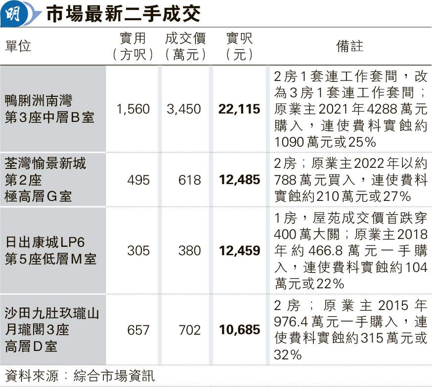 【明報專訊】二手樓市欠缺新利好消息支持,頻見蝕讓或低價成交;鴨脷洲南灣新錄蝕逾千萬元成交,市場消息稱,南灣第3座中層B室,實用面積1560方呎,原則屬2房1套間隔,現改為3房1套戶型,望避風塘海景,新近以3450萬元易手,實呎22,115元;原業主2021年以4288萬元購入,持貨近3年,帳面蝕約838萬元或近兩成,連使費料實蝕約1090萬元或25%。