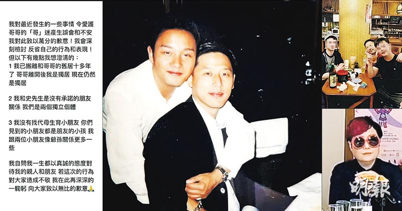 【明報專訊】張國榮(哥哥)逝世21年,生前摯愛唐鶴德(唐唐)自2015年4月1日哥哥死忌或其他重要日子,都會在在社交平台上載兩人昔日的生活照,跟「哥迷」同分享;他曾寫道:「死生契闊,與子成說。執子之手,與子偕老。」近日內地網瘋傳唐鶴德疑有新歡,是比他年輕27歲的史姓新歡,對方手臂滿紋身,被形容為「花臂男」,有傳他的手腕還紋上「唐」字,甚至傳兩人請代母誕下兒子;網傳不少唐鶴德跟兩個小男孩的照片。傳聞經幾日發酵,昨日唐鶴德公開回應,就傳聞令「哥迷」不安感歉意,亦交代跟史姓男的關係。