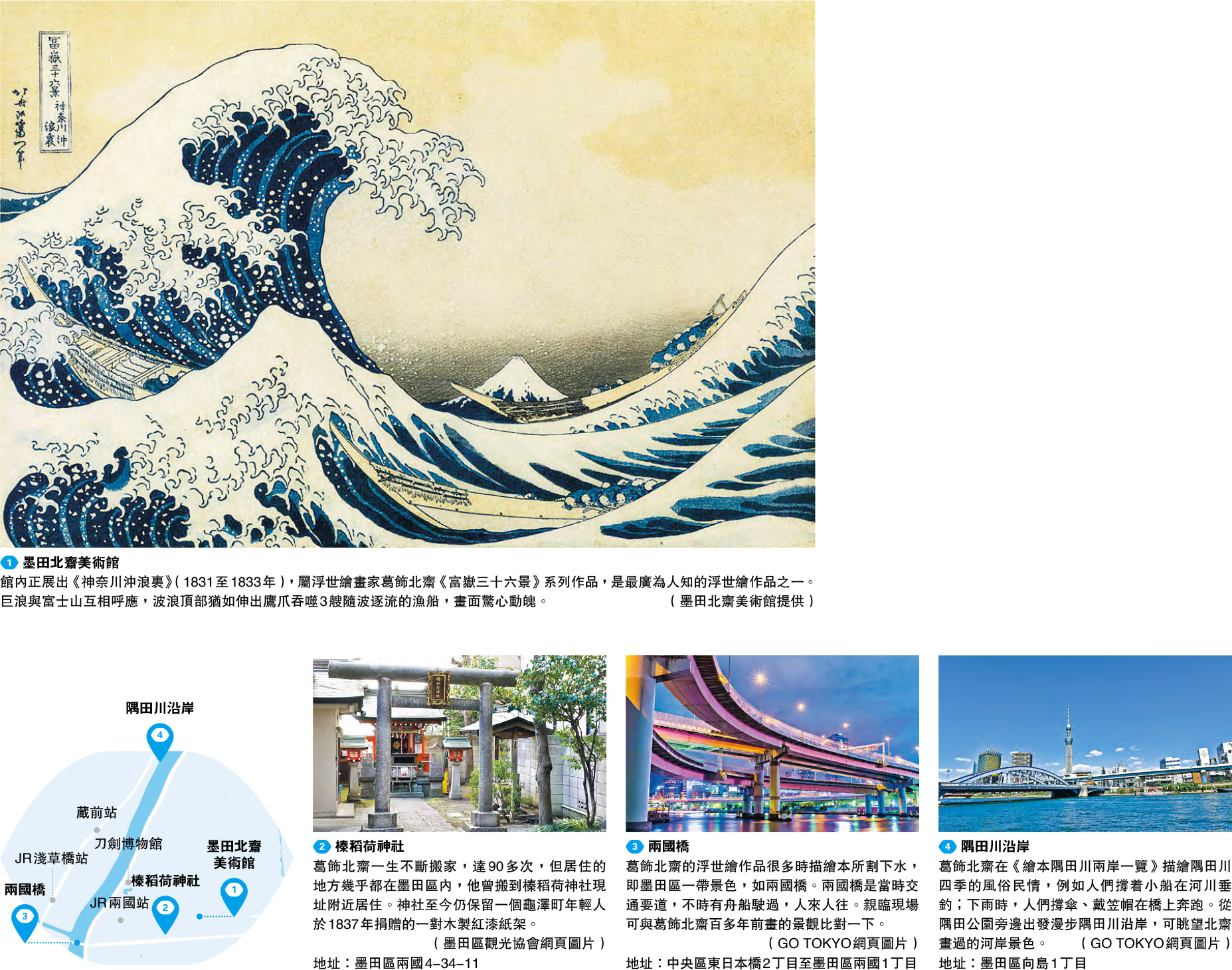 東京的墨田北齋美術館趁這段時間舉辦「The Impact of Hokusai’s Great Wave : Under the Wave off Kanagawa—Tracing Its Origins and Trajectory」(北齋巨浪衝擊:神奈川巨浪的誕生與軌迹)展覽,以《神奈川沖浪裏》為主軸,介紹它如何代表日本,深入人心,以及為後世藝術界帶來的影響。看完巨浪後,再到墨田區尋找北齋的生活蹤迹。