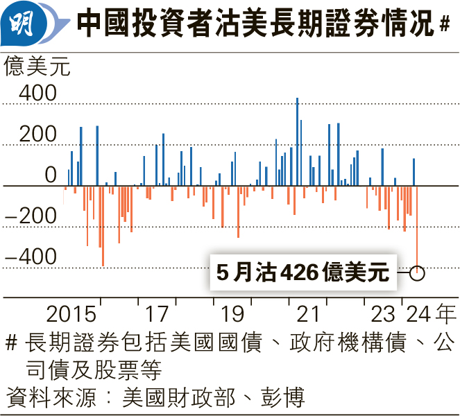 【明報專訊】彭博報道,由於中美外交緊張局勢持續升溫,中國投資者5月拋售的美國股票和債券創新高。根據美國財政部最新數據顯示,中國基金合共淨賣出426億美元的長期證券,包括國債、政府機構債(agency bonds)、公司債等,創下歷史新高。今年首5月累計出售797億美元的證券。